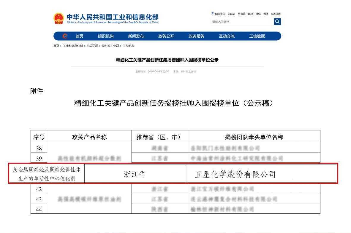 近日,工业和信息化部发布《精细化工关键产品创新任务揭榜挂帅入围揭榜单位公示》,嘉兴市高新技术企业协会副会长单位——卫星化学股份有限公司(以下简称“卫星化学”)研发的“茂金属聚烯烃及聚烯烃弹性体生产的单活性中心催化剂”攻关项目,成功入围国家级“揭榜挂帅”名单,在服务国家战略需求、承担国家级科技攻关任务上再次迈出关键一步!
